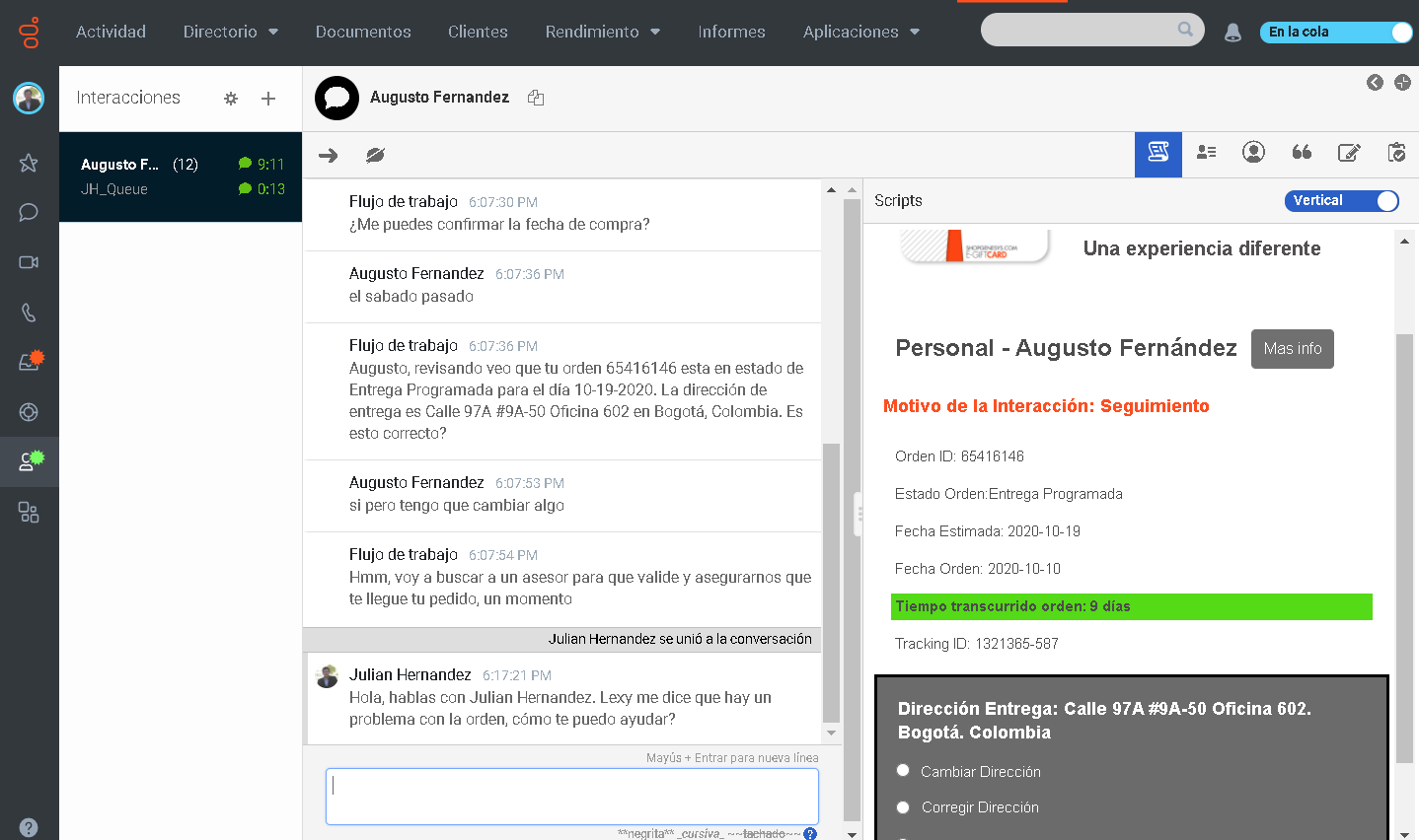 Al igual que sucede con las llamadas, en las interacciones digitales en caso de necesitar apoyo de un agente, estas son transferidas acorde con la estrategia de enrutamiento que se haya definido, llegándole al agente la interacción, acompañada de la transcripción de la conversación entre el cliente y el bot.