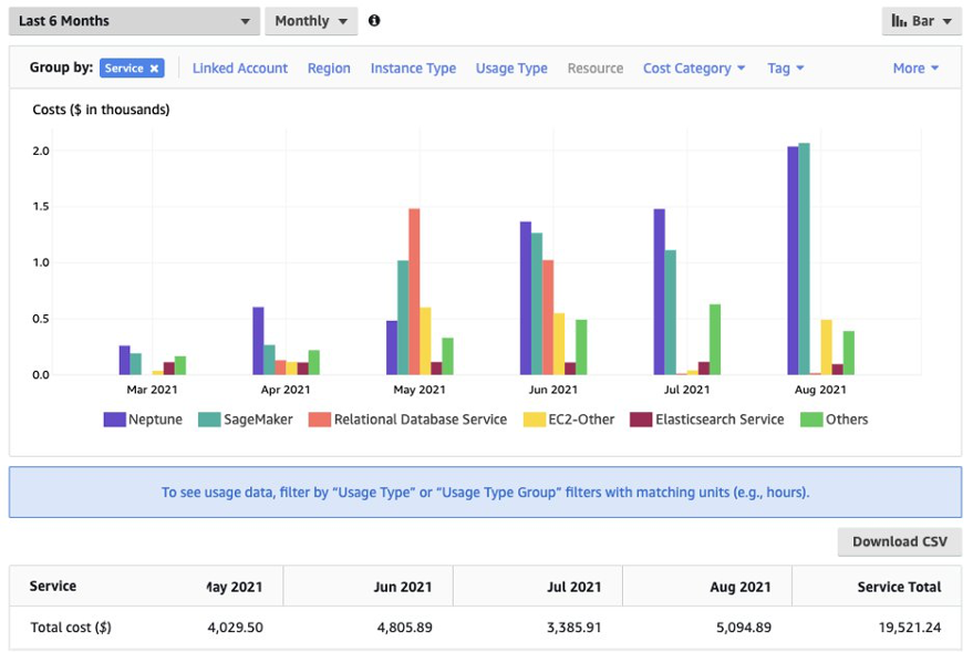 - Si no es así, ¿ha ejecutado cargas de trabajo en AWS durante los últimos seis meses? Si es así, vaya a la página principal de AWS Cost Explorer en la vista predeterminada, que se muestra a continuación, verá su gasto total de los últimos seis meses. Tome el promedio de este valor mensual y utilice esta cifra para el valor de su presupuesto.
