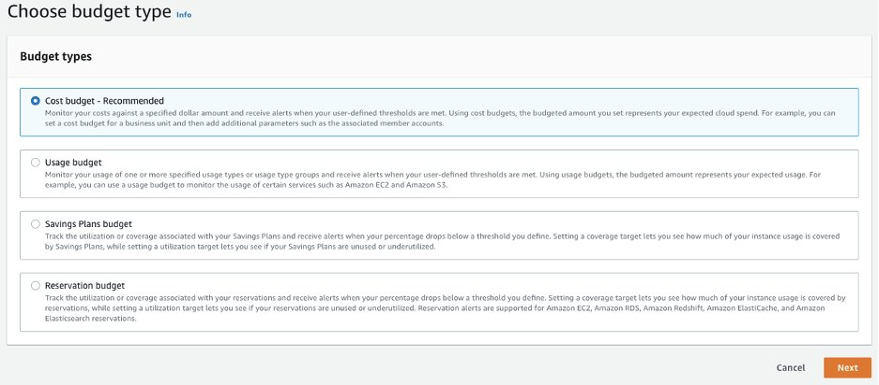 Una vez que haya determinado su valor objetivo, vaya a AWS Budgets y cree un presupuesto. Como el objetivo es asegurarte de no gastar demasiado dinero en todos los servicios, elige el presupuesto de costes, que llevará un registro de tu gasto en dólares.