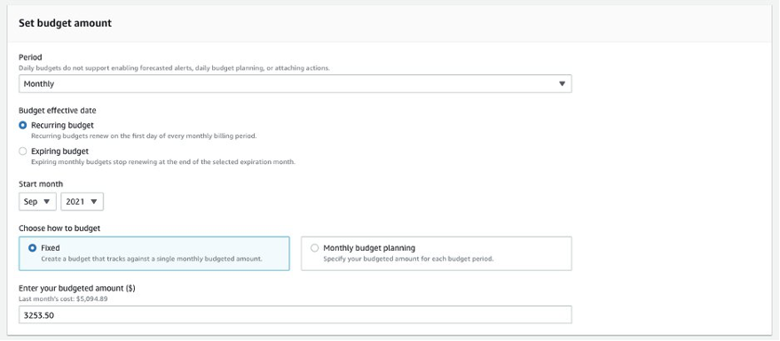 Sin embargo, como práctica recomendada, deberá tener un presupuesto independiente para cada carga de trabajo que ejecuta. Puede utilizar los alcances presupuestarios para ayudar a supervisar aspectos como los costos de pruebas y desarrollo de nuevos servicios o tipos de instancias de Amazon Elastic Compute Cloud (Amazon EC2), o para establecer presupuestos para diferentes equipos de su organización. Puedes encontrar más ejemplos de presupuestos personalizados que puedes configurar para evitar cargos inesperados aquí.