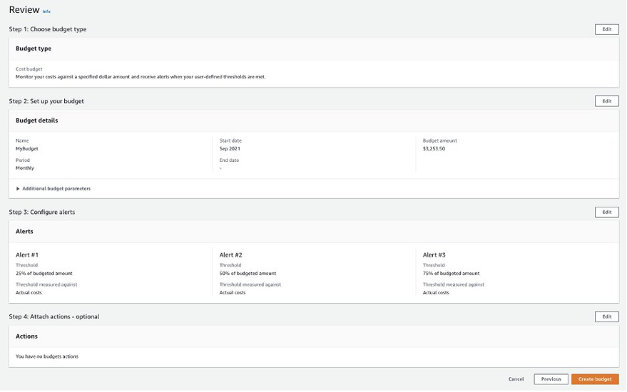 AWS Budgets le permite establecer presupuestos para realizar un seguimiento de sus costos y uso, y recibirá notificaciones cuando se superen los presupuestos en los umbrales definidos. AWS está diseñado para gestionar cargas de trabajo de cualquier tamaño, desde empresas emergentes en fase inicial hasta empresas maduras, por lo que es importante contar con un método para detectar los sobrecostos o los gastos inesperados. Establecer un presupuesto desde el principio lo prepara para el éxito y le ayudará a desarrollar buenos hábitos de costo desde el inicio de sus proyectos.