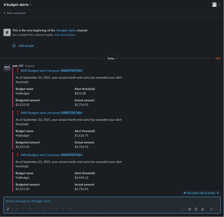 Para una configuración más avanzada, puede canalizar las notificaciones a otros canales mediante Amazon Simple Notification Service (Amazon SNS), que le permitirá ampliar los métodos de notificación a SMS, puntos de enlace HTTP y otros. Si te gusta usar Slack, puedes conectar Amazon SNS con AWS Chatbot para recibir tus alertas de presupuesto en el canal de Slack. Para obtener más información sobre cómo conectar Amazon SNS con AWS Chatbot para Slack, siga este enlace.