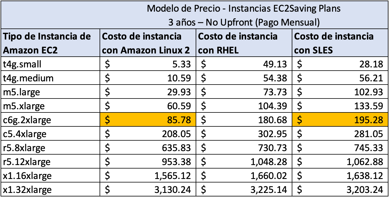 Tabla 1: Modelo de precios de instancias de EC2 mediante Saving Plans (plan de ahorro)