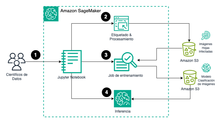 - Los científicos de datos ejecutan el etiquetado, procesamiento, entrenamiento e inferencia a través de una Jupyter Notebook gestionada por Amazon SageMaker Studio.