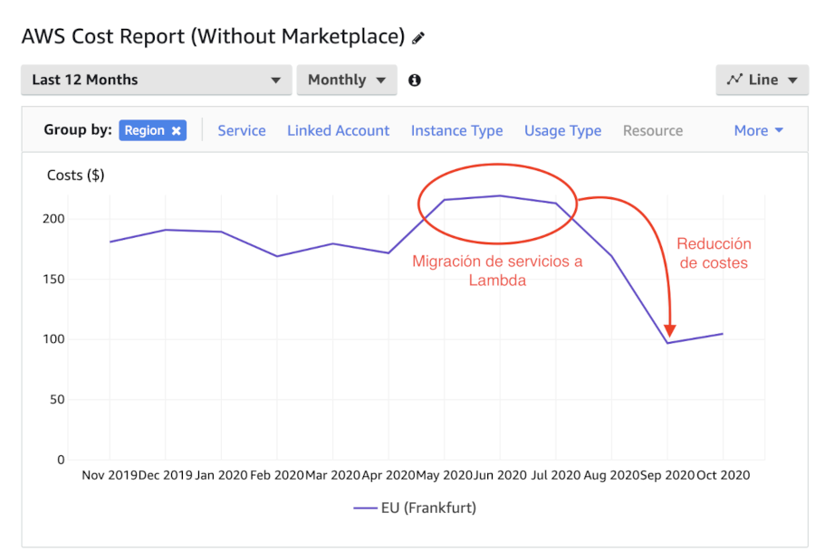 Con la adopción creciente de tecnologías serverless en la aplicación de gestión de pedidos/procesos de San Saru se ha conseguido un ahorro en costes de infraestructura de hasta el 120% a lo largo de un mes y medio (Figura 5). “Es increíble, con un gasto de solo 4 dólares al mes hemos cubierto un volumen de hasta 1,3 millones de peticiones en AWS Lambda.” – comenta el CTO.