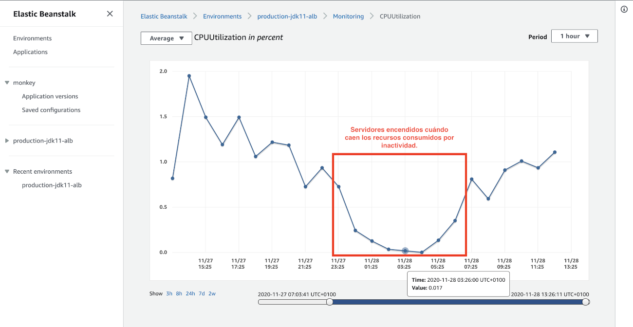 Sin embargo, por la naturaleza de la estructura monolítica del código fuente de la aplicación, también en momentos del día en los cuales no se registraba una alta demanda de CPU, la infraestructura en Elastic Beanstalk implicaba que los servidores EC2 se quedaran operativos 24/7 a causa de procesos que tenían que ejecutarse de manera continua en el tiempo, como por ejemplo la sincronización de pedidos en el ERP con la aplicación web de la tienda online, entre otros. Esta ineficiencia en la utilización de potencia de computación en la infraestructura (que se muestra en la Figura 1), dio lugar a un buen margen de optimización en coste.