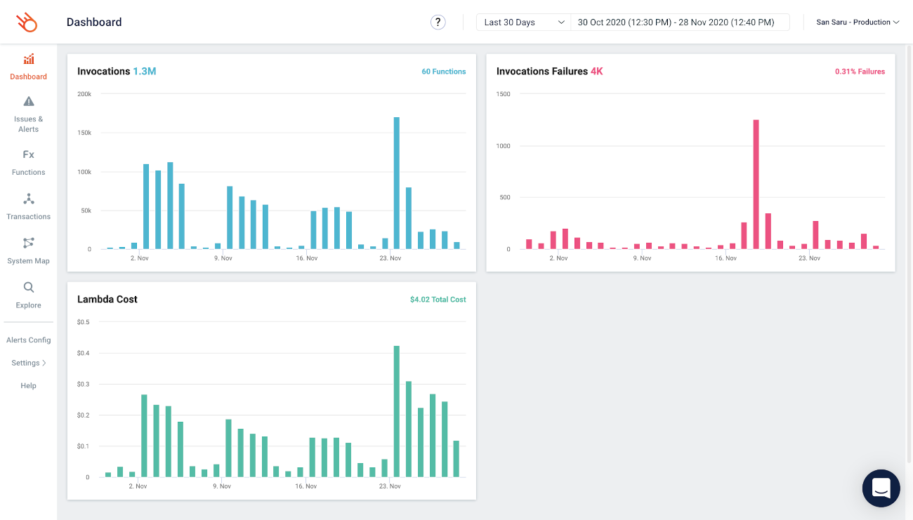 Figura 3 – Dashboard de monitoreo de invocaciones, fallos y costes de AWS Lambda en Lumigo