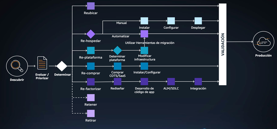 - Selección de estrategia: durante esta etapa seleccionamos cuál estrategia es la indicada para migrar el workload o tecnología a la nube. El criterio de selección es sobre la base del objetivo de la migración. Cada estrategia tiene sus características, ventajas y desventajas.