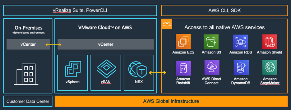 VMware Cloud on AWS es un servicio bajo demanda que le permite ejecutar aplicaciones en entornos de nube basados en vSphere con acceso a una amplia gama de servicios de AWS. Con la tecnología de VMware Cloud Foundation, este servicio integra VMware vSphere, VMware vSAN y VMware NSX junto con la administración de VMware vCenter, y está optimizado para ejecutarse en una infraestructura AWS dedicada, elástica y bare-metal. Con este servicio, los equipos de TI pueden administrar sus recursos basados en la nube con herramientas conocidas de VMware.