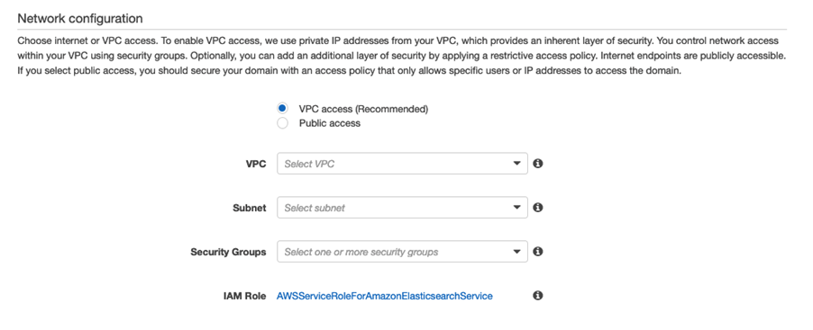 La primera decisión sobre redes y seguridad que se debe tomar es si el acceso se realizará a través de Internet o a través de una red privada virtual de Amazon (VPC) . Según la documentación: « Para habilitar el acceso a VPC, utilizamos direcciones IP privadas de su VPC, lo que proporciona una capa inherente de seguridad. Puede controlar el acceso a la red en su VPC mediante grupos de seguridad. Si lo desea, puede agregar una capa adicional de seguridad aplicando una política de acceso. Los endpoints de Internet son accesibles al público. Si selecciona acceso público, debe proteger su dominio con una política de acceso que permita que sólo usuarios o direcciones IP específicas accedan al dominio».