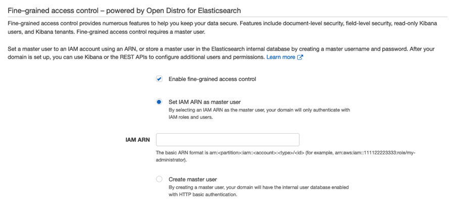 El control granular de acceso require la configuración de un usuario maestro en el dominio de Elasticsearch. Este usuario maestro podrá crear los usuarios, los roles con los permisos requeridos para acceder a la información y los mapeos entre usuarios y roles. En un dominio de Amazon Elasticsearch service hay dos opciones para definir este usuario maestro: la primera es seleccionar un ARN de IAM como usuario maestro (y en ese caso todas las solicitudes al cluster deben ser firmadas usando AWS Signature V4). La otra es crear un usuario maestro que será almacenado en la base de datos interna de Elasticsearch (en este caso las solicitudes al cluster también pueden utilizar HTTP Basic authentication).