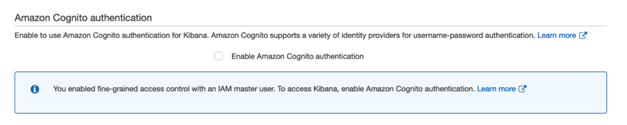 Si escoge utilizar el control granular de acceso con un usuario maestro en IAM, se recomienda el uso de Amazon Cognito para autenticar el acceso a Kibana (ya que si no lo habilita, la página web de autenticación de Kibana no funcionará). Por otro lado, si escoge utilizar el control granular de acceso con un usuario maestro almacenado internamente en la base de datos de Elasticsearch, debe deshabilitar la opción de utilizar Amazon Cognito para autenticar el acceso a Kibana. Esto se debe a que para autenticación de usuarios, Amazon Cognito utilizará su propio repositorio de usuarios en lugar de la base de datos interna (y por lo tanto si usa Amazon Cognito, no podría acceder al usuario maestro).