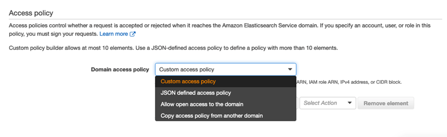 La cuarta decisión de seguridad que se debe tomar es cuál política de acceso al dominio utilizar. Una política de acceso al dominio es una política aplicada a un recurso (resource-based policy) puede permitir o negar el acceso de una cuenta AWS (ya sea por ID o por ARN), usuario de IAM, rol de IAM, dirección IPv4 o bloque CIDR. Las opciones se presentan a continuación. La política de acceso personalizada (Custom Access policy) facilita la creación de la política ya que presenta una interfaz donde solo deben llenarse los campos necesarios, solo necesita tener la información del ARN, ID o dirección IP.
