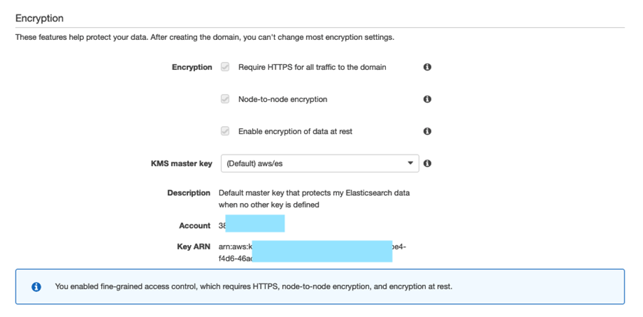 La quinta y última decisión es la parte de cifrado. En esta sección se ofrece la posibilidad de habilitar la criptografía en tránsito (obligando que todo tráfico de acceso al dominio use HTTPS y que la comunicación entre nodos del cluster esté cifrada) así como habilitar el cifrado de datos en reposo (incluyendo tanto los índices como los snapshots). Elasticsearch usa una llave de AWS Key Management Service (KMS) para proteger las llaves que encriptan el dominio. Puede optar por usar una llave administrada por AWS, utilizar una llave creada y gestionada por usted en KMS o inclusive utilizar una llave de KMS de otra cuenta. Las llaves creadas por los clientes se pueden configurar para rotar automáticamente anualmente. Las claves administradas por AWS se rotan automáticamente cada 3 años.