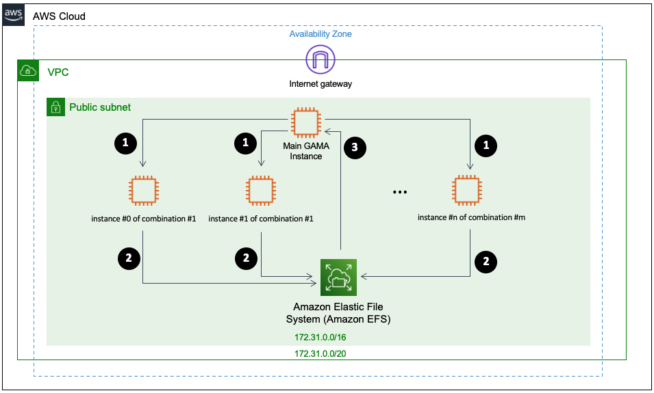 - Distribución de configuraciones y disparo de simulaciones (1) (mediante un desarrollo sobre APIs BOTO3) en instancias de trabajo Amazon EC2 aprovisionadas con Amazon Machine Images (AMI) personalizadas con el simulador GAMA (en modo headless) configurado con el modelo del distrito de Marcos Paz desarrollado. Dichas instancias almacenan los resultados de su simulación en un file system Amazon Elastic File System (EFS) compartido (2).