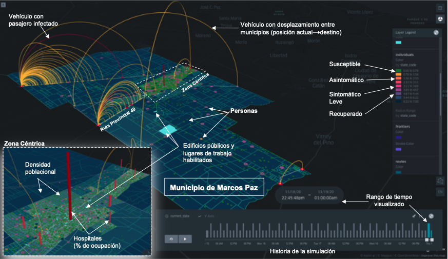 Dentro de la solución, un componente clave es la definición del modelo específico para el Municipio de Marcos Paz. Con el objetivo de analizar la dinámica de contagios relacionados con las posibles fases de aislamiento en diferentes escenarios, y el impacto de la conectividad con otros municipios, se buscó un modelo altamente parametrizable, capaz de generar múltiples escenarios poblacionales y representar diversas políticas sanitarias, obteniendo resultados similares en orden de magnitud a los observados en la realidad (específicamente en Marcos Paz).