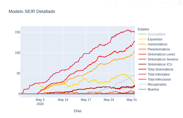 Utilizamos 9 compartimientos para los estadíos desde el punto de vista de su clasificación epidemiológica y de la severidad de la enfermedad: