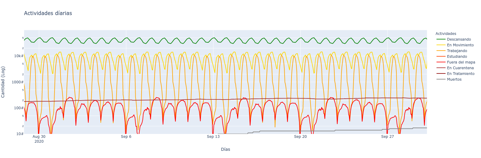 Representa la cantidad de individuos realizando cada una de las posibles actividades modeladas. Se puede apreciar como hay mayor actividad durante la semana en comparación al fin de semana. A su vez, en los horarios pico la cantidad de individuos en movimiento aumenta.
