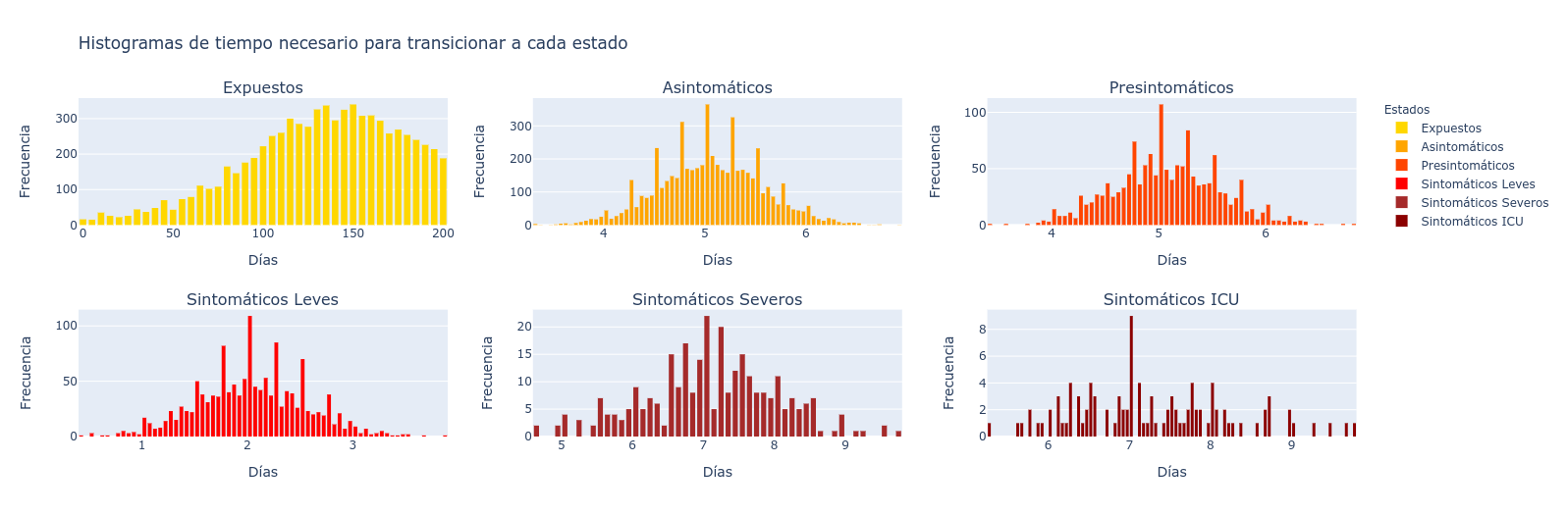 Tiempo necesario para transicionar a un estado N desde su estado N-1. Por ejemplo, la media de días para transicionar a Asintomático desde Expuesto es de 5 días. Útil para validar valores ingresados mediante parámetros.