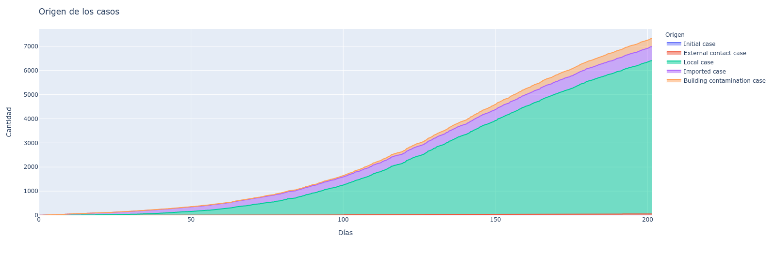 Podemos analizar el origen de los contagios. Los mismos pueden ser casos iniciales configurados en la simulación, o casos por transmisión comunitaria, por un contagio fuera de los límites de Marcos Paz (caso importado), por un contagio por contacto dentro de las fronteras de Marcos Paz con alguien que no reside en el mismo (caso de contacto externo) o por contaminación residual (carga viral) en edificios con mala renovación de aire.