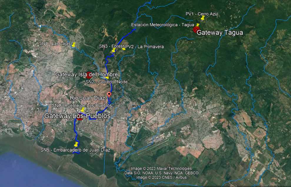 Imagen 6: Ubicación de los sensores y gateways a lo largo de la cuenca del Rio Juan Diaz.