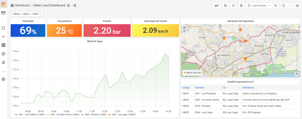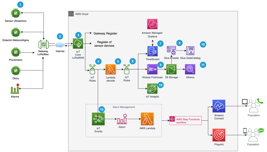 En esta primera fase del proyecto se utilizó el servicio de AWS IoT Core para LoRAWAN para administrar los gateways y sensores compatibles con LoRaWAN, así como la seguridad y conectividad con los sensores IoT ultrasónicos de nivel, pluviómetros, estaciones meteorológicas etc. que ya están enviando datos a AWS, también se desarrollo de una solución para integrar los datos recibidos desde los sensores, gestionar alarmas y crear tableros de monitoreo.