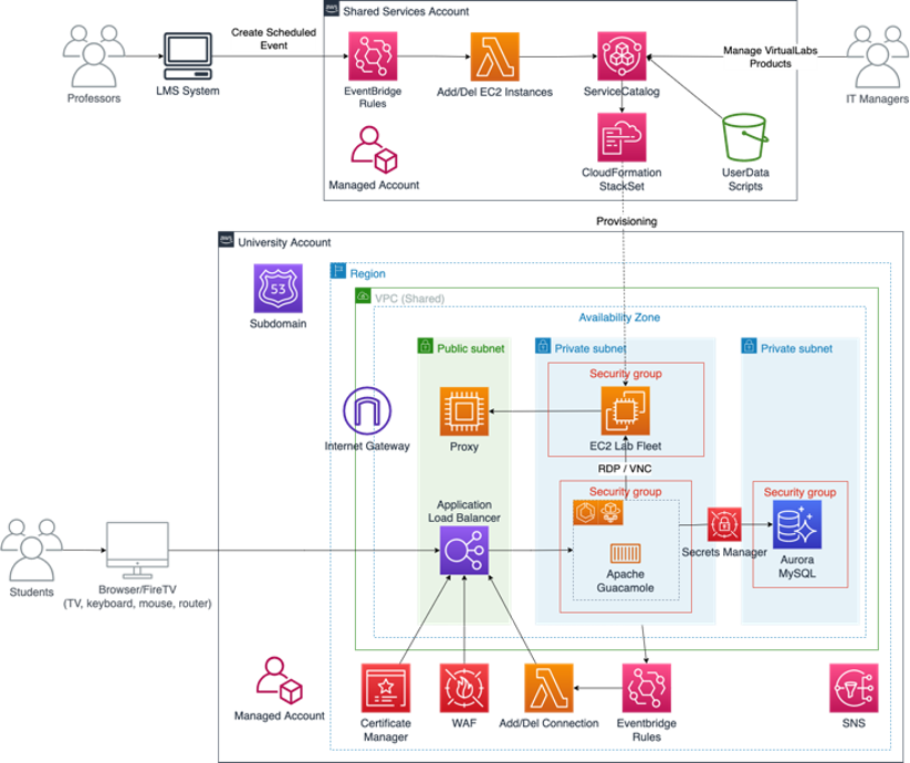 La configuración inicial de la solución utiliza un entorno multicuenta, lo que permite a los gerentes de TI distribuir los costos del laboratorio virtual con las unidades universitarias. En una cuenta de servicios compartidos, ejecute la solución automatizada, donde el administrador de TI puede crear un portafolio de AWS Service Catalog con productos de flotas Spot EC2 de Windows y Linux utilizando Amazon Machine Image (AMI) o scripts de UserData personalizados; esto será útil para abstraer los requisitos técnicos al aprovisionar las instancias de la interfaz del sistema de gestión de aprendizaje (LMS).