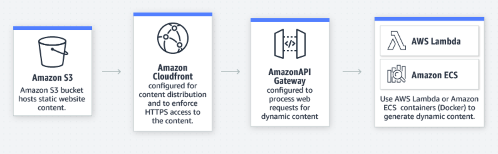 La siguiente imagen (Fig2) muestra una arquitectura de referencia donde se aloja una pagina web estática usando Amazon S3 y una distribución de contenido con Amazon CloudFront. El backend se ejecuta utilizando Amazon APIGateway, AWS Lambda y/o Amazon ECS.