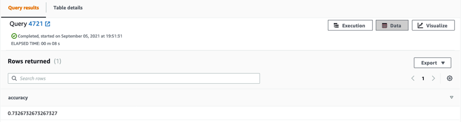 --Inferencia/Precisión en datos de prueba WITH infer_data AS ( SELECT risk as actual, func_risk_prediction_model(existingchecking,duration,creditamount,savings,employmentsince,sex,status,age,housing,existingcredits,job,jobtype,dependents)AS predicted, CASE WHEN actual = predicted THEN 1::INT ELSE 0::INT END AS correct FROM risk_prediction_inference ), aggr_data AS ( SELECT SUM(correct) as num_correct, COUNT(*) as total FROM infer_data ) SELECT (num_correct::float/total::float) AS accuracy FROM aggr_data;![]()