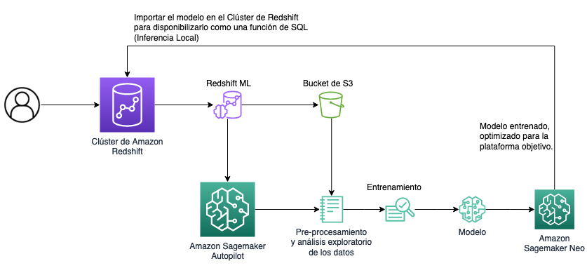 Amazon Redshift ML facilita a los analistas de datos y desarrolladores, la creación, el entrenamiento y la aplicación de los modelos de Machine Learning usando comandos familiares de SQL en Amazon Redshift. Se pueden aprovechar las capacidades de Amazon Sagemaker (Servicio de Machine Learning completamente administrado) haciendo uso de Amazon Redshift ML, sin necesidad de aprender nuevas herramientas o nuevos lenguajes. Con simples consultas de SQL se puede crear y entrenar un modelo de Machine Learning usando los datos en Redshift y después, usar los modelos para hacer predicciones. Redshift ML disponibiliza el modelo de Machine Learning como una función de SQL dentro del Data Warehouse de Redshift, para poder aplicarlo directamente en las consultas y reportes.
