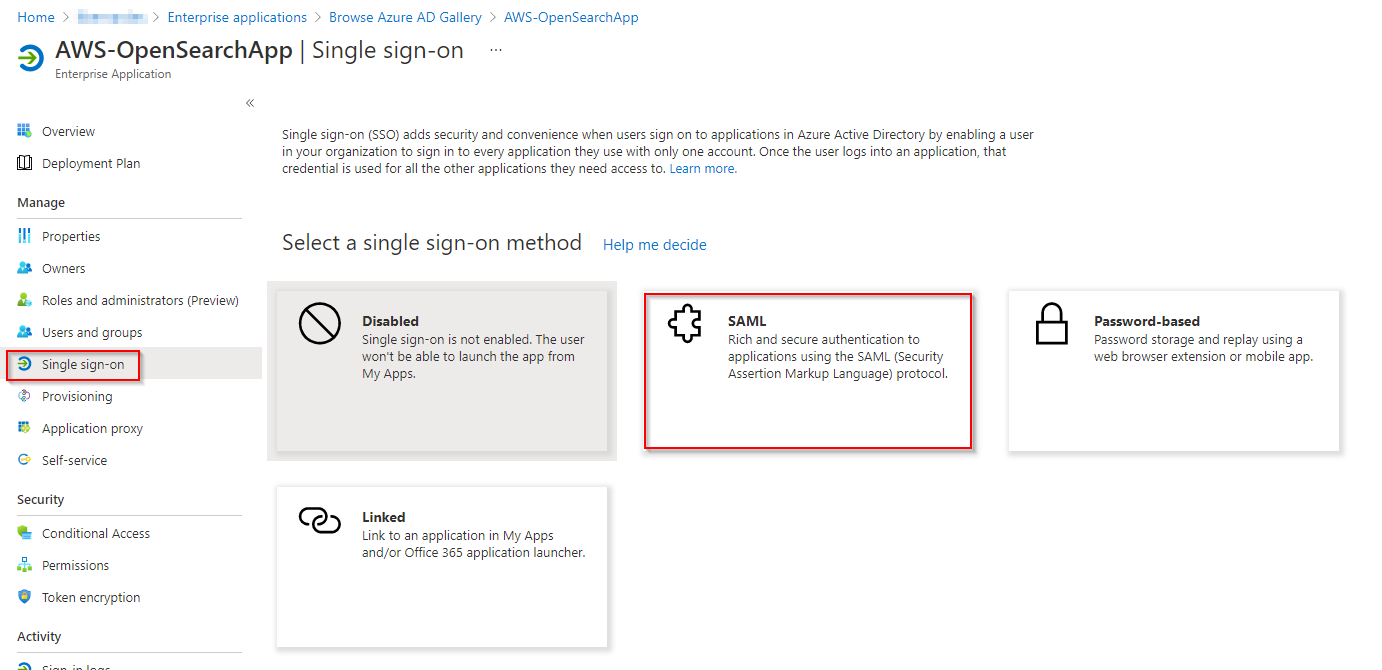 Volviendo a la configuración de la aplicación en Azure AD, era necesario realizar ajustes en el estándar SAML 2.0, lo que permitía la integración con los paneles de OpenSearch. Entonces, fuimos a «Single Sign-On» y hicimos clic en «SAML»: