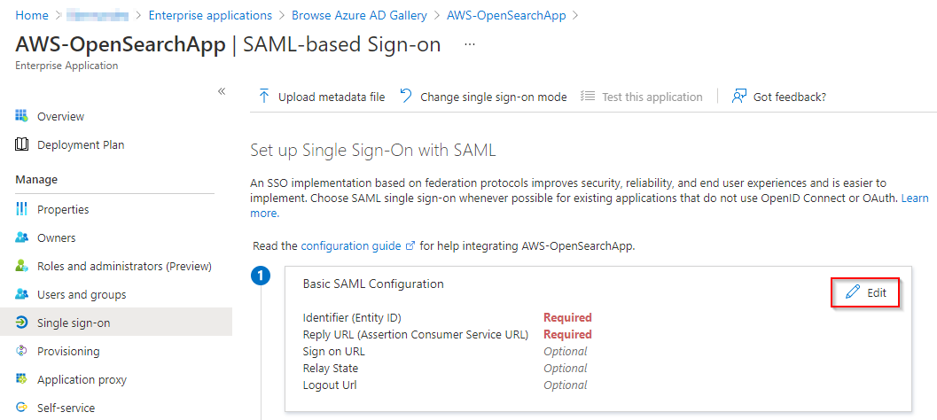 En la siguiente pantalla, hacemos clic en «Editar» en la sección «Configuración básica de SAML»: