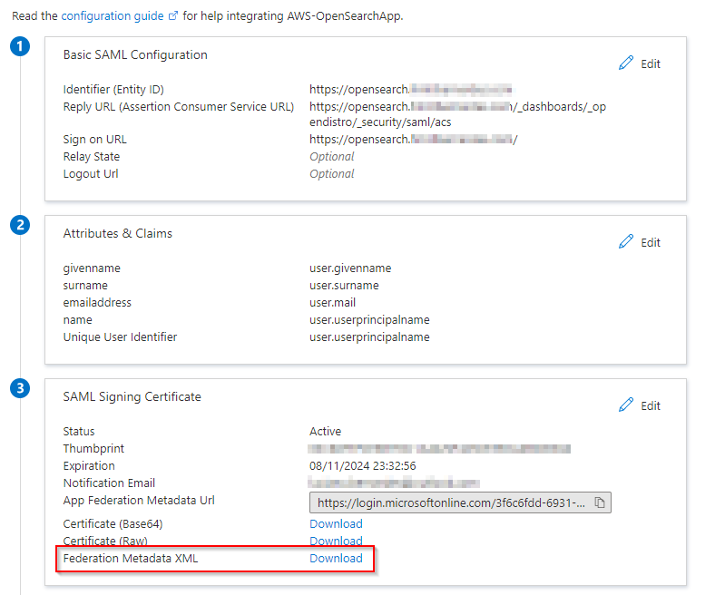 Una vez completado este paso, descargamos el archivo XML de metadatos de federación para completar la configuración en el lado de Amazon OpenSearch Service:
