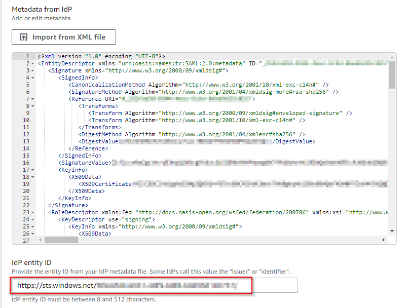 Con la importación de archivos, el campo «ID de entidad de IdP» se completó automáticamente (el formato XML puede variar):