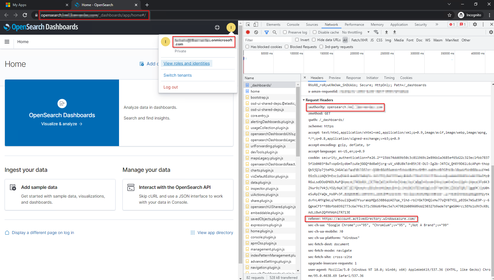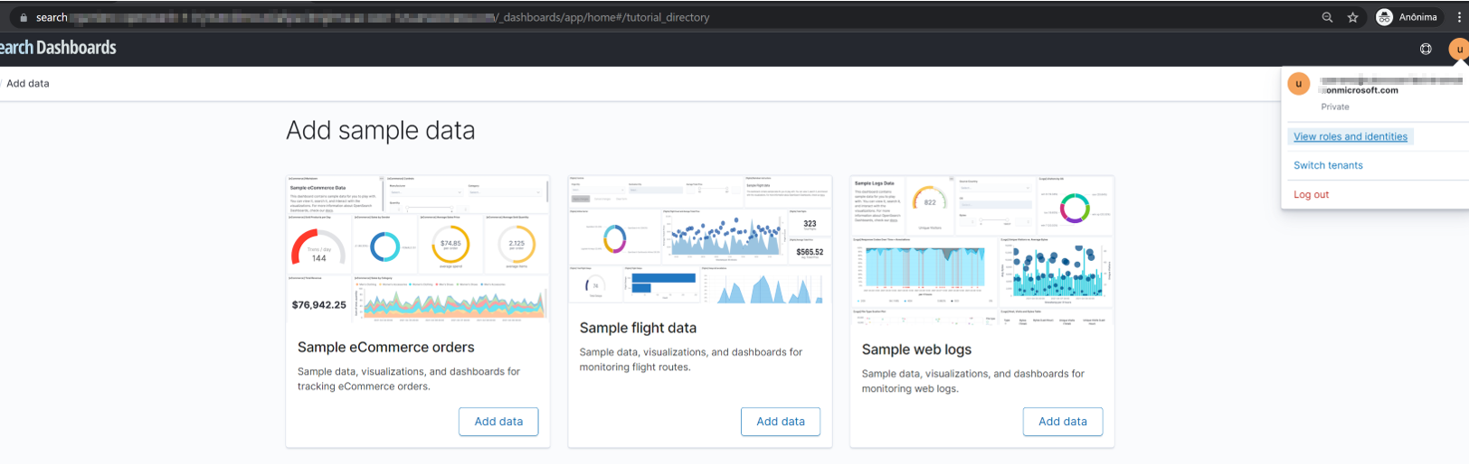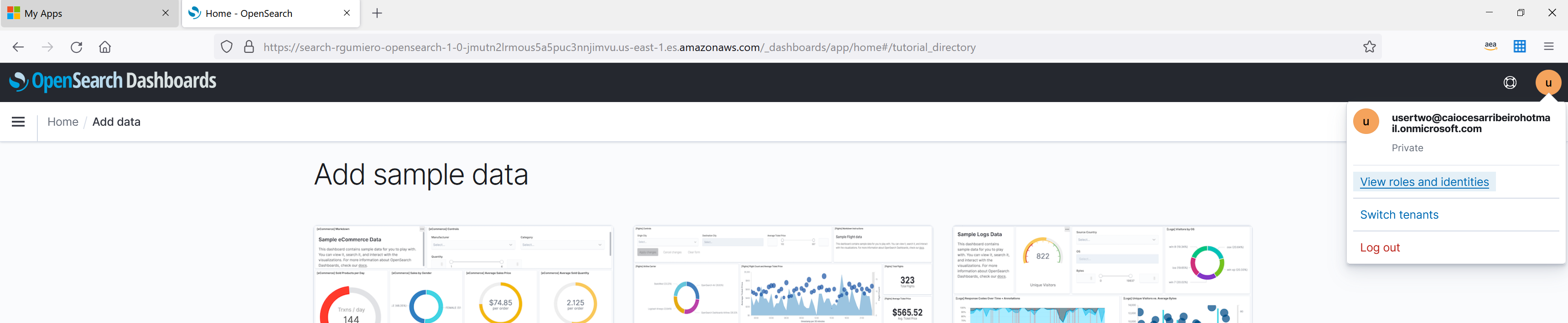 Con estas configuraciones realizadas, utilizando el usuario o el miembro del grupo, fue posible acceder a los paneles de OpenSearch a través de SSO, con la credencial de Azure AD. Para hacer esto, se puede acceder a través de la aplicación en https://myapplications.microsoft.com, como se indicó anteriormente, o a través de la «URL de paneles de OpenSearch»/«URL de paneles de OpenSearch personalizados» (por ejemplo, https://myopensearch.mydomain.com). En ambos casos, la solicitud de autenticación se dirigió a Azure AD mediante el estándar SAML.