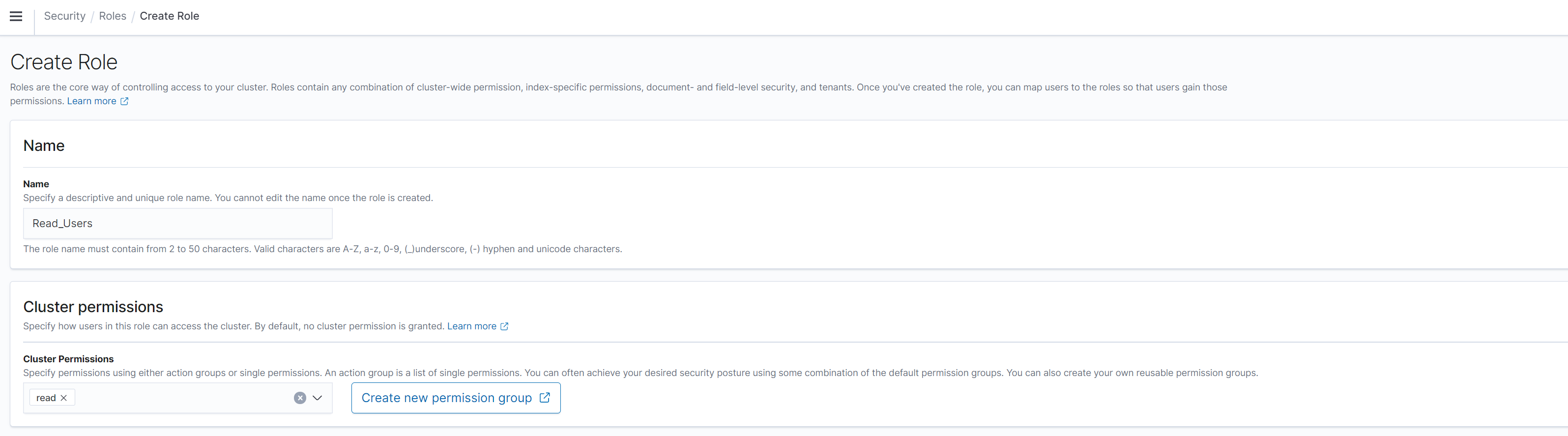 En esta misma pantalla, tenemos dos configuraciones indicadas como «nombre de usuario maestro SAML» y «rol de backend maestro SAML». Completamos estos campos con un usuario y un grupo de Azure AD, lo que otorga a los paneles de OpenSearch acceso maestro a través del inicio de sesión único, siendo efectivamente un administrador de servicios. Una vez configurado, puede usar este usuario/grupo para realizar la administración de objetos en Amazon OpenSearch Service, creando otras funciones u otros usuarios vinculados a Azure AD.