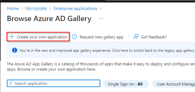 En el lado de Azure AD de nuestro laboratorio, creamos una aplicación empresarial personalizada. Por lo tanto, en la página del IdP hacemos clic en «Aplicaciones empresariales» y luego en «Todas las aplicaciones\ Nueva aplicación»: