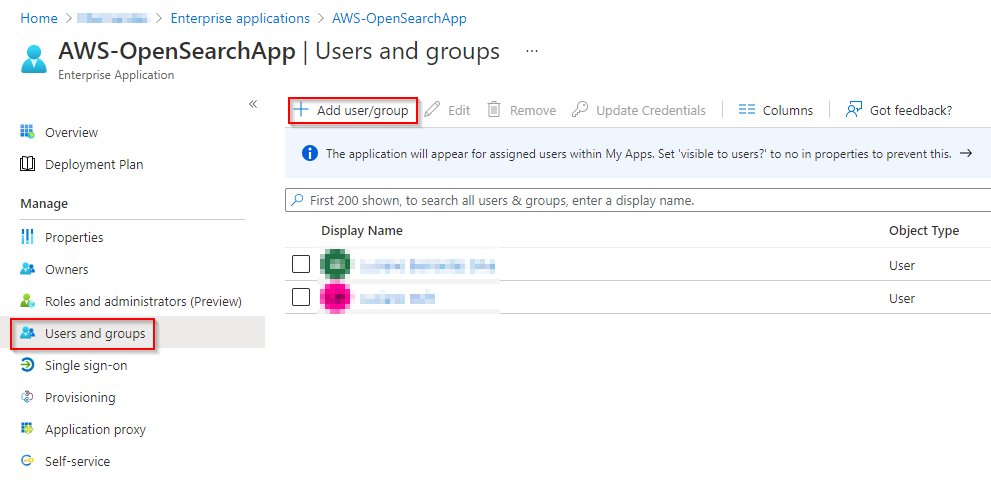 Una vez creada la aplicación, era necesario realizar algunos ajustes de permisos para los usuarios y/o grupos y reconocer OpenSearch Dashboards como un proveedor de servicios. Por lo tanto, abrimos la aplicación y fuimos a «Usuarios y grupos\ Agregar usuario/grupo»: