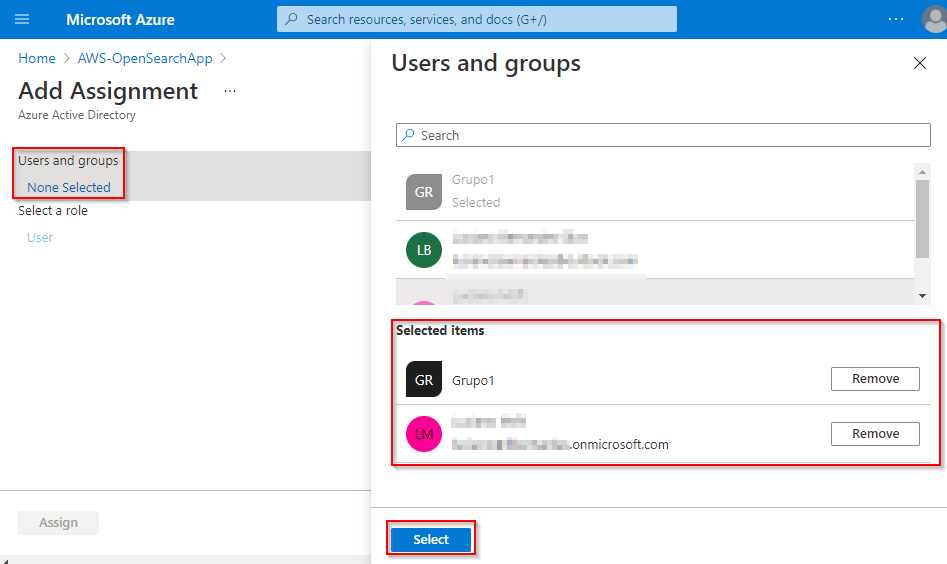 En la siguiente pantalla, seleccionamos usuarios y grupos que deberían tener acceso a la aplicación y, en consecuencia, podrían realizar el inicio de sesión único para OpenSearch Dashboards. A continuación hacemos clic en «Asignar»: