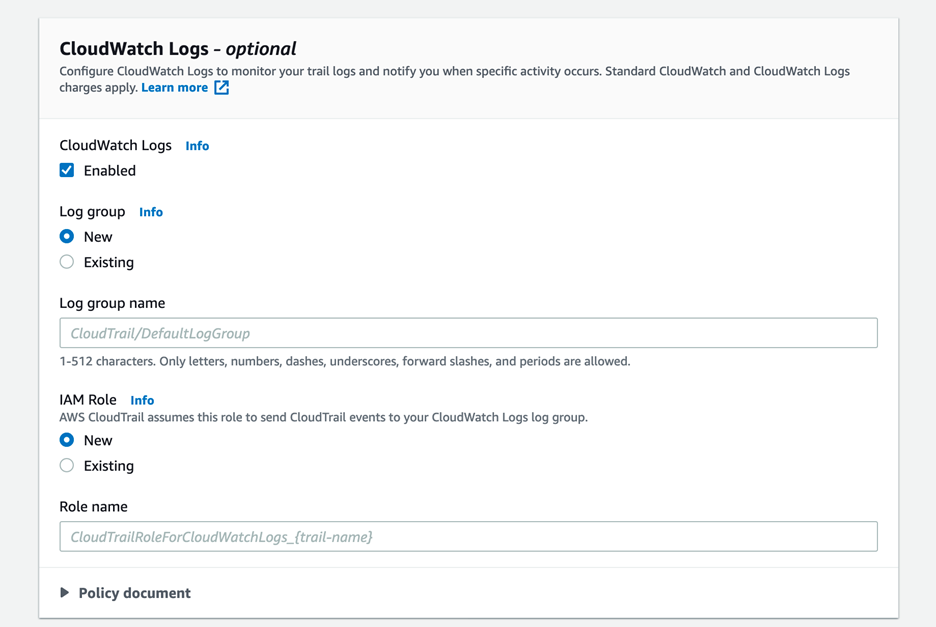 Figura 1: Habilitar registros de CloudWatch: en la creación de CloudTrail, en el cuadro Registros de CloudWatch opcional, active la casilla de verificación Habilitar. En Grupo de registros, se selecciona la opción Nueva. En los roles de IAM, se selecciona la opción Nueva.