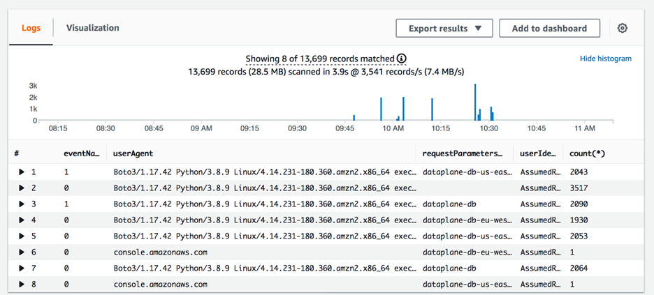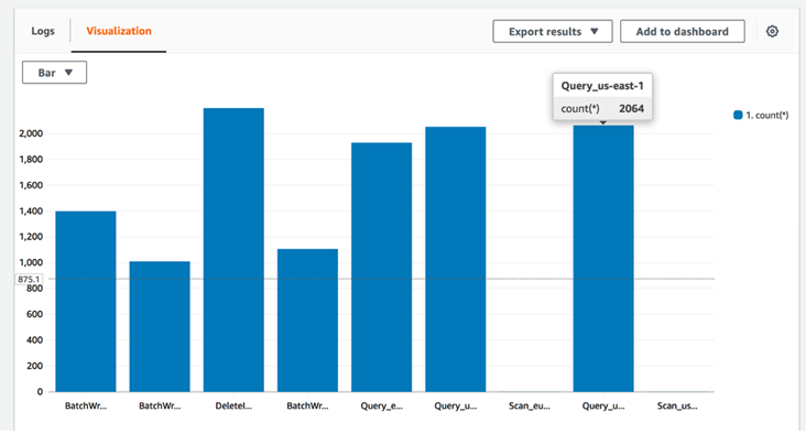 Cuando está habilitada, esta función entrega todos los eventos al mismo bucket de S3, separados por región y tabla, lo que crea un bucket centralizado para todos los registros, lo que ayuda a crear reglas de administración centralizadas para el contenido. La visualización multirregional ayuda al personal responsable a tener una visión centralizada del contenido para tener una vista única para mantener el cumplimiento de los registros de datos. El siguiente ejemplo es una consulta de CloudWatch Logs Insights que muestra el recuento de cada evento (DeleteItem, BatchWrite, Query y Scan) dentro de la tabla de DynamoDB, por región dentro de una cuenta de AWS en los últimos 45 minutos