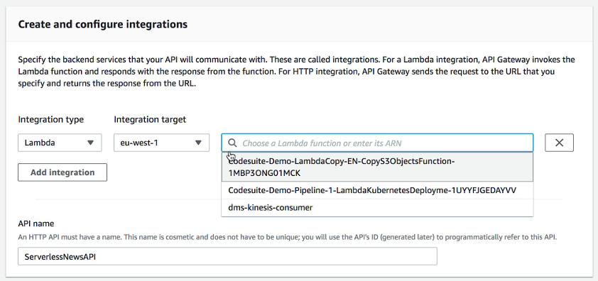 Al seleccionar la opción para construir una nueva API (Build), podemos comenzar a incluir integraciones con recursos existentes (funciones Lambda o endpoints HTTP).