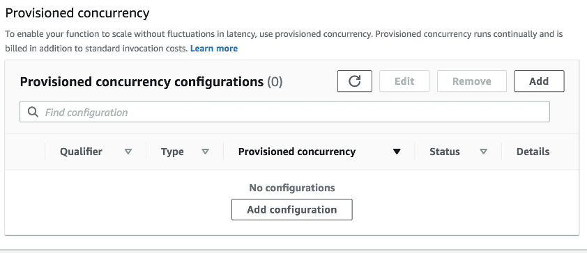 Para no tener el problema del arranque en frío cuando se ejecutan funciones Lambda, podemos aprovisionar los entornos de ejecución de acuerdo con la concurrencia de acceso esperada. Para cada rol que desee realizar el aprovisionamiento, debe crear una configuración de aprovisionamiento en la sección específica de la consola.