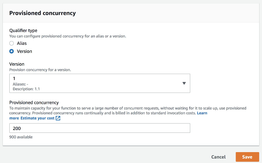 En la configuración de aprovisionamiento debe asignar a qué Alias o Versión específica de la función Lambda se estará invocando en los entornos de ejecución, y también deberá también fijar la cantidad de concurrencia.