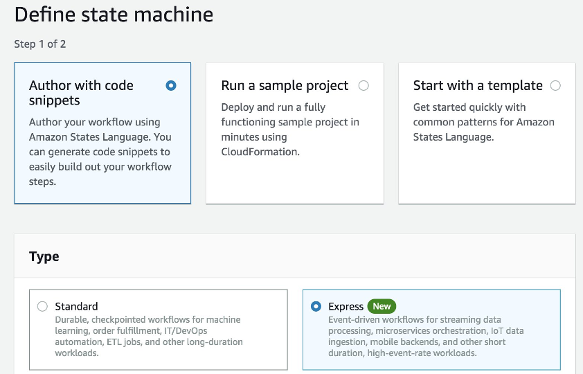 - Flujos de trabajo rápidos de Step Functions: Los flujos de trabajo Express utilizan el mismo modelo de especificación declarativa que Step Functions Standard, pero está diseñado para casos de uso con gran volumen y corta duración de transacción (hasta 5 minutos). Los flujos de trabajo Express están diseñados para admitir una tasa de invocación por cuenta de AWS superior a 100.000 eventos por segundo;