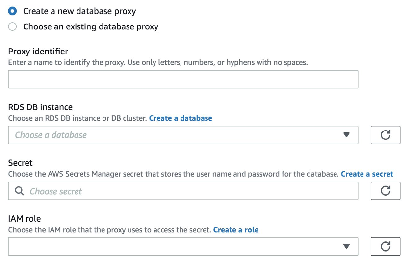 La configuración del proxy define a qué instancia de RDS desea acceder, el secreto que almacena las credenciales de acceso a la base de datos registradas con AWS Secrets Manager y el rol que da acceso a esta última.