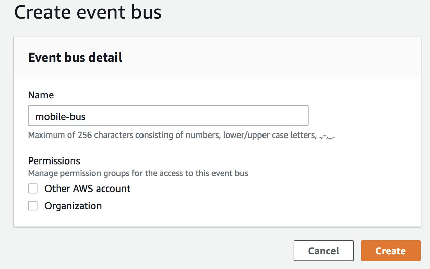 Para crear un bus de eventos para su aplicación, simplemente asígnele un nombre y defina quién puede tener acceso a su bus.