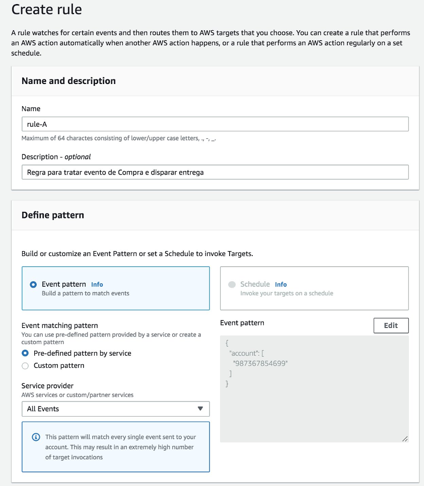 - Destinos (servicios de AWS) para eventos recibidos en el bus que cumplan el estándar establecido anteriormente;