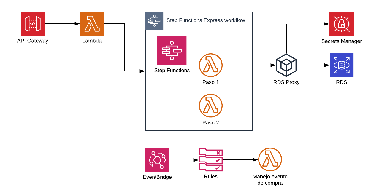 Es muy común que las transacciones en una aplicación (por ejemplo, transacción de compra) impliquen varios pasos: validación, comprobación y persistencia de la información. En una implementación basada en funciones de Lambda, la recomendación es evitar que las diferentes funciones específicas de cada paso sean orquestadas por otra función de Lambda, lo que dificulta la visibilidad del proceso como un todo y consume más recursos del tiempo de ejecución de Lambda. Una buena alternativa es utilizar las funciones de pasos de AWS que le permiten coordinar varias llamadas a servicios (incluidos los servicios de AWS) en flujos de trabajo sin servidor. En aplicaciones con un volumen de alta demanda y en las que se desea una latencia baja, la función Express Workflows ayuda a ofrecer rendimiento y menores costos de infraestructura.