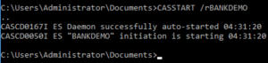 Ingresamos las líneas de comando para activar el servidor, por ejemplo BANKDEMO, en el script de compilación. El comando es básicamente: > casstart /r <name-of-server>. En el caso del ejemplo BANKDEMO, el comando utilizado es: > casstart /rBANKDEMO
